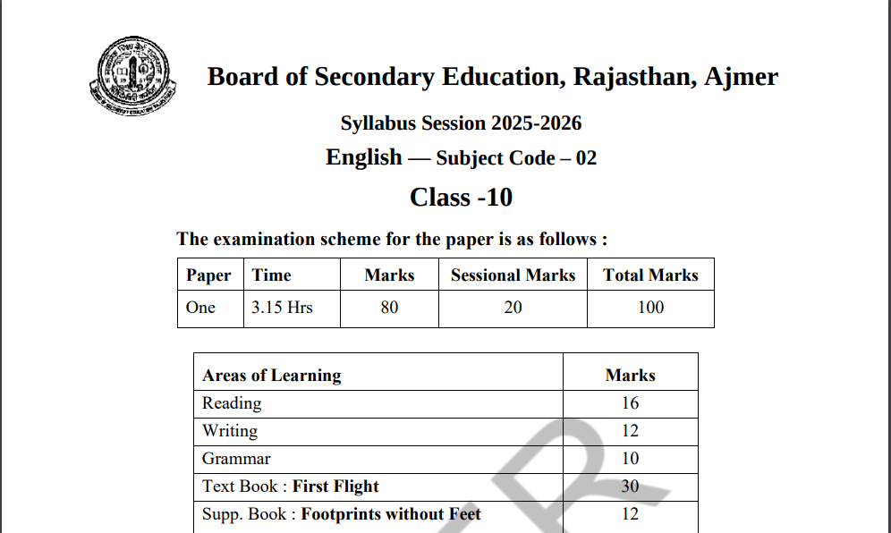 इंग्लिश में रीडिंग सेक्शन के लिए 15 अंक आवंटित किए जाएंगे जिसमें गद्य और कविता दोनों शामिल होंगे। क्लास 10वीं 2026 के लिए आरबीएसई ब्लूप्रिंट (RBSE Blueprint for Class 10th 2026) यहाँ देखें: