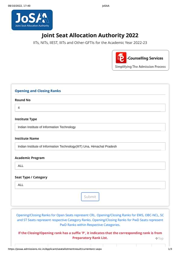 JoSAA Round 4 IIIT Cutoff 2022 PDF for opening & closing ranks has been released along with seat allotment result on October 8. Download the PDF of JoSAA Round 4 closing ranks 2022.